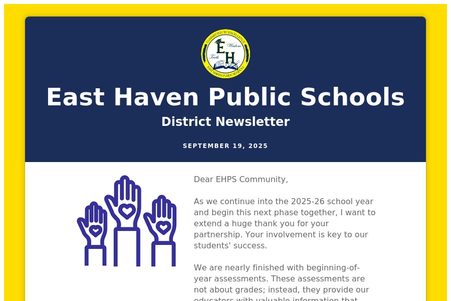 East Haven Public Schools District Newsletter September 19, 2025 Dear EHPS Community, As we continue into the 2025-26 school year and begin this . . .